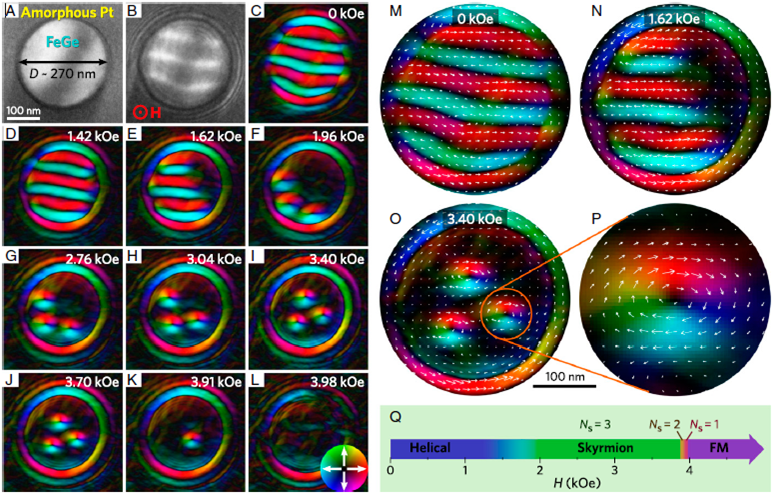 具有非中心对称立方结构的金属螺旋磁体,如MnSi、FeGe,由于同时存在自旋、轨道、晶格多种自由度的关联与耦合,表现出丰富的材料特性,一直是金属磁性材料领域研究的热点与前沿。2009年,科研人员在此类材料中发现一种拓扑稳定且具有粒子特性的磁结构,即磁斯格明子(Skyrmion)。斯格明子具有尺寸小、稳定性高和易操控等系列特点,具有潜在的应用价值,可用于构建未来高密度、高速度、低能耗磁存储器件,引起了学术界的广泛关注。制备、探索并利用螺旋磁体纳米结构的物性,是推进斯格明子实用化的关键之一。