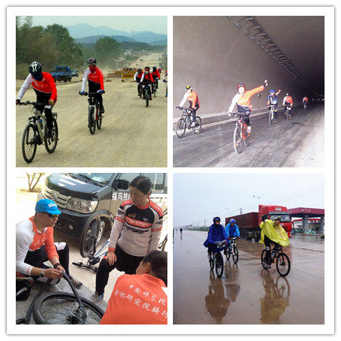 骑行第三天(5月2日)——雨中骑行的考验。从清晨开始的雨不停的下了一整天。除保障车和一辆便车带走了部分人和车以外,骑行队有8位勇士,披上雨衣,毅然踏上征程,完成了他们80公里的雨中回程之旅。雨水与汗水早已分不清,顺着脸颊流进嘴里;骑行眼镜上的雨点不时模糊了视线,危险丛生;大货车呼啸而过,溅起的雨水,瞬间灌满了鞋子,泥浆溅满全身,车胎一个接一个爆裂,走走停停补补,当天又有5辆车先后爆胎(全程总共补胎8次,换新胎2个),幸运的是全体骑行者都安然无恙,一道顺利返回。