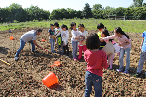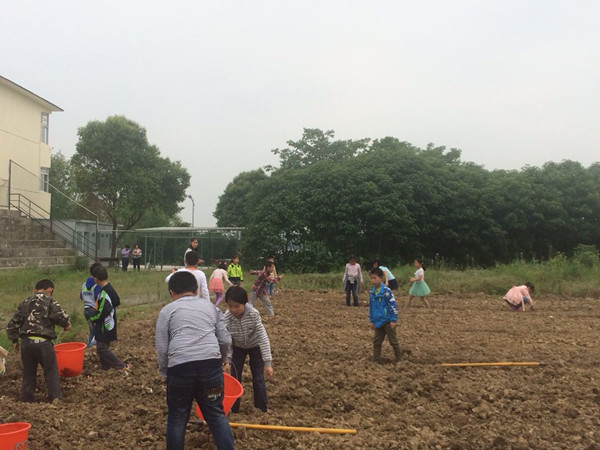 科学岛实验小学种植园地坐落在科学岛技校西南角的空地上,占地2.5亩。种植园一共被划分成16垄菜地,主要种植农作物,由每个班的老师、学生一起承包管理,学生每周都要去种植基地进行劳动实践。5月16日下午的班会课,全校老师带着学生一起来到种植园。大家扛着锄头、铲子,拎着肥料、水桶。烈日下,在自己班级所管理的菜地里,孩子们进行松土、施肥,然后亲手撒下黄豆、豆角、玉米等种子,真正体验到了什么是“锄禾日当午,汗滴禾下土”。老师一边劳作,一边还带领孩子认识各种农作物种子,讲解种植方法。学生虽然汗流浃背,却掩饰不住内心的激动与对果实收获的期待。