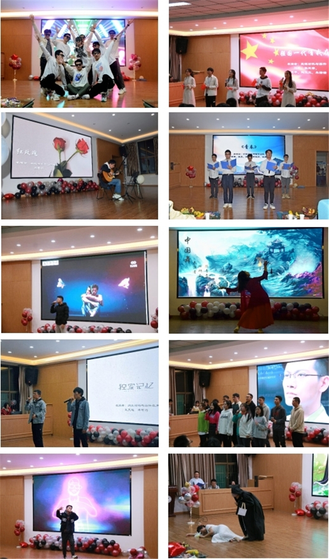 开场舞《护花使者》拉开了晚会的序幕。能源部杨芷芊、刘爽等同学的合唱《强国一代有我在》,激昂的歌声生动诠释了科研人立志奉献于祖国伟大事业的决心;纳米部张翰林同学的吉他独奏《红玫瑰》弦音袅袅、动人心弦;计算部姚德元、黄孝腾等同学用一首诗朗诵《青春》表达了对李大钊先生的怀念和敬仰。接着,内耗部同学带来舞蹈《失恋阵线联盟》,欢快的节奏和活跃的动作演绎了科研人恋爱的波折;核安全所罗温伟同学作为特约嘉宾献上一曲《国王与乞丐》,赢得了观众们的阵阵掌声;固体所研会主席陈青青的古风舞《逍遥》,曼妙的舞姿若仙若灵,让师生们完全陶醉于其中;纳米部李可为、王天旭同学合唱《独家记忆》勾起了大家对美好青春的回忆;环境部梁波、黄聪聪等同学的歌曲串烧《最初的梦想+奔跑+我的未来不是梦》展现了科研人为了梦想,不忘初心、砥砺前行的奋斗精神;晚会主持人梁波同学的《庆功酒》身随律动,嗨翻全场。功能部申继兵、熊婷娇等同学表演的舞台剧《白雪公主》诙谐幽默,别出心裁地演绎了“科研版”白雪公主的故事,笑料百出,将晚会推向了高潮。在晚会尾声,计算部姚德元、翟振阳等同学的《红歌串烧》借词达意,回顾了中国共产党百年的奋斗历程。