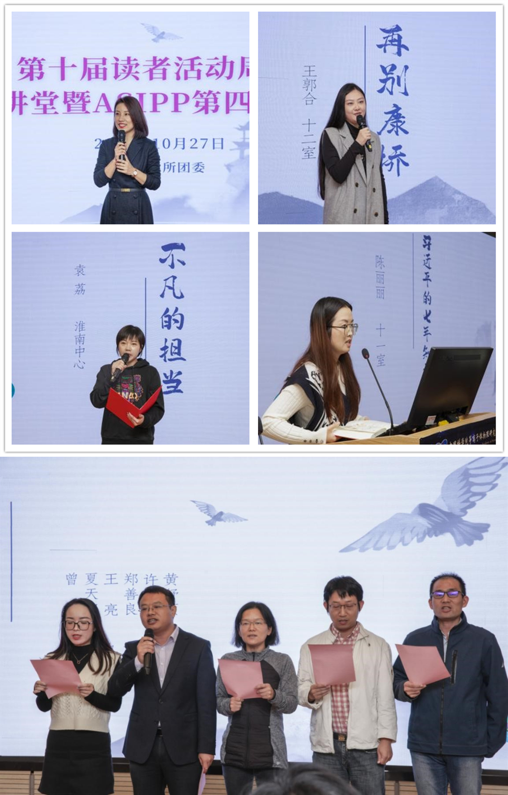 现场还举办了ASIPP第四届诵读会。王郭合、袁莉、陈丽丽分享了经典作品,曾龙、夏天阳、王亮、郑善良四位所青年科研骨干作为特邀嘉宾和所团委黄舒颍一起朗诵了毛泽东主席的《沁园春·长沙》。全场观众在阅读的引领下浸润在浓浓的书香氛围中,感受中华传统文化的博大魅力。