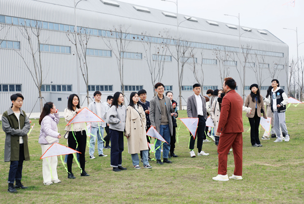 春光下,大家在草地上间牵线奔跑,共同放飞手工绘制的风筝,为“春之约”联谊活动画上完美句号。