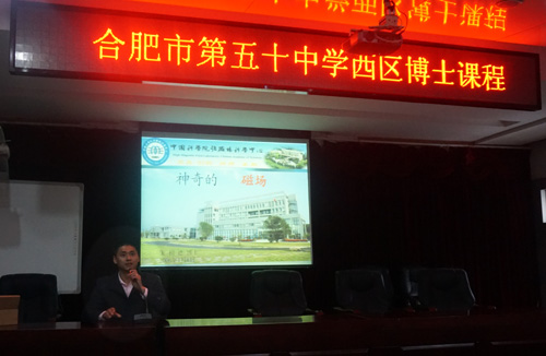 4月6日下午,中科院合肥研究院团委组织的“蒲公英科学传播志愿活动”走进了50中校园,强磁场中心朱相德博士为两百余名初中生带来了题为《神奇的强磁场》专题科普报告。