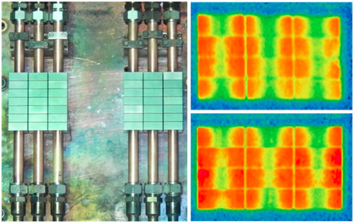 钨铜穿管模块及1000次20MW/m2辐照时表面红外温度图