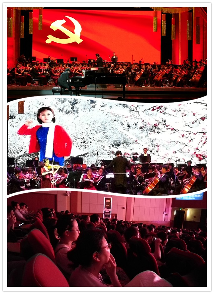 音乐会在雄壮的交响序曲《红旗颂》中拉开帷幕,接着,艺术家们以独唱、重唱、领唱、合唱等表演形式以及小提琴协奏、管弦乐、交响诗等艺术形式为观众演绎了《红色娘子军》、《红梅赞》、《洪湖赤卫队》、《山丹丹开花红艳艳》等耳熟能详的经典歌曲、乐曲,随着艺术家们的精彩演奏和演唱,背景的大屏幕上不断播放着许多珍贵的历史画面和激动人心的场景,观众不时报以热烈的掌声;激情磅礴的钢琴协奏曲《黄河》将音乐会带入高潮,一首《春天的故事》唤起人们许多的回忆;《共筑中国梦》《把一切献给党》的大合唱更是在全场引起强烈共鸣。最后,全场起立齐唱《没有共产党就没有新中国》,歌声在音乐大厅里久久回荡,一种无形的正能量在每位现场观众中传递......