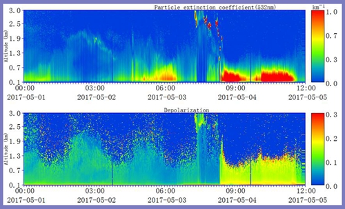 安光所颗粒物激光雷达及走航技术产业化平台——无锡中科光电技术有限公司,在河南省安阳市也观测到另一股沙尘输送过程。观测结果显示,沙尘输送到河南省境内,无论在浓度还是在持续时间上,都远低于北京地区的沙尘。