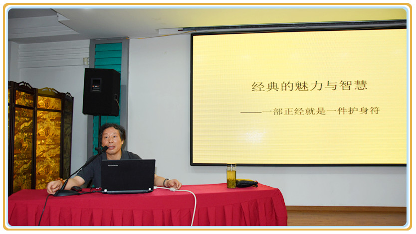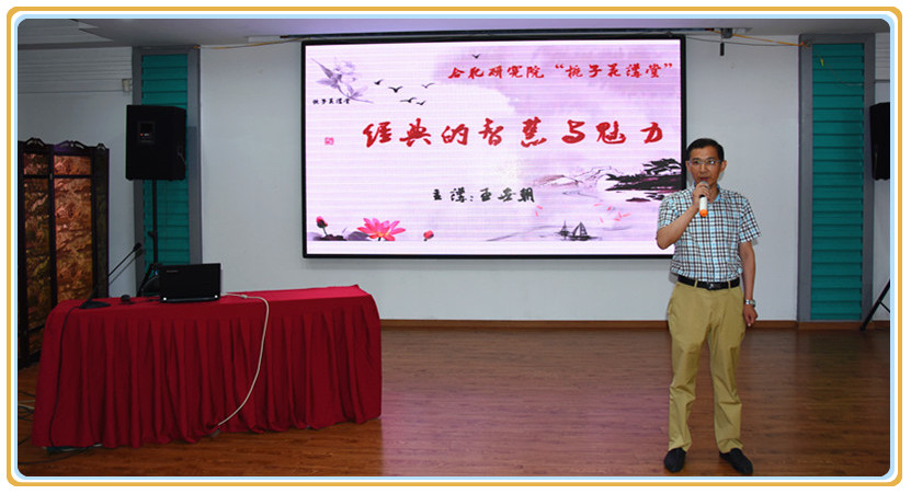 随后,合肥学院中文系王世朝教授为大家带来题为《经典的智慧与魅力》报告。王教授先从西方哲学界对东方智慧的评价着手,结合当前的社会情态及现状,引经据典,分别从“经典的诠释”、“人本与人道”、“君子人格与社会良知”、“德治与法制”几方面,阐述了中国文化的博大精深和源远流长。王教授谈古论今,文史纵横,通过诠释儒家、道家、法家等几大经典主流学派核心思想,解析了当前普遍存在的人文现状及解决方法,深入浅出地阐明了国学内涵及精髓——经典智慧帮助大家更明晰生命的意义,经典的魅力帮助大家提升管理境界。王教授娴熟而幽默的口才,家乡俗语的妙用,网络流行语的巧引,引得场下不时爆发出阵阵热烈的掌声。台上讲得妙趣横生、神采飞扬、台下听众聚精会神,手机丢在一旁,笔记本上记下满满数页,短短两个多小时的培训,所有参训职工均被国学魅力所吸引,徜徉在智慧海洋中,享受了一场经典国学的文化盛宴。