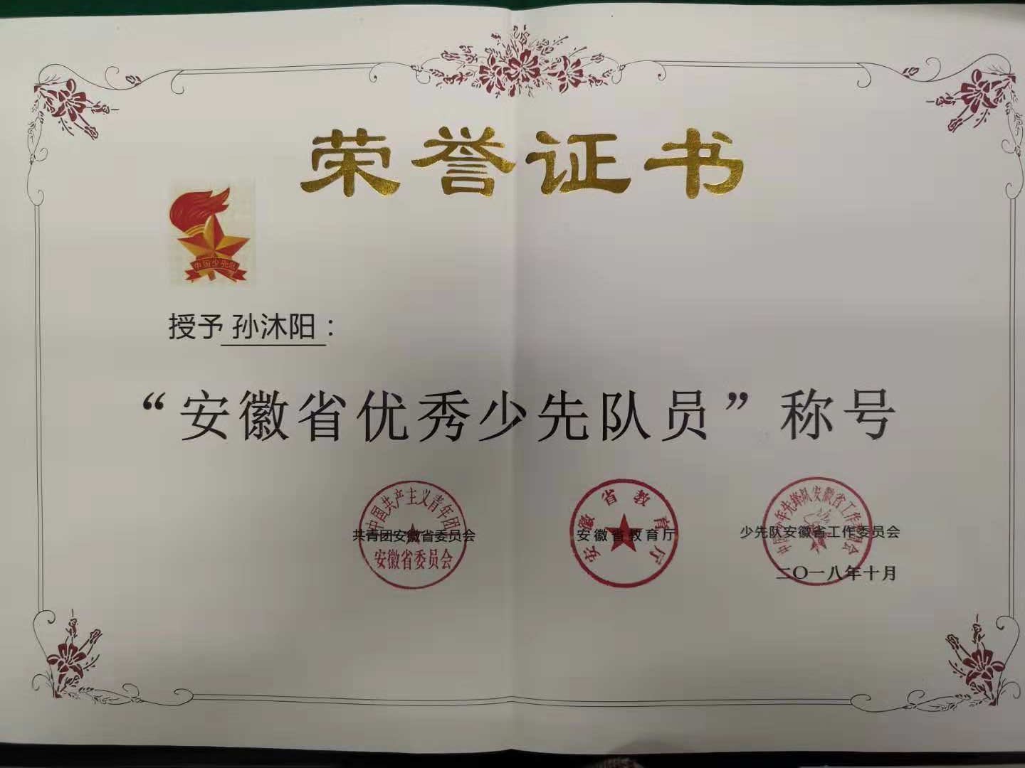 孙沐阳同学是一名德、智、体全面发展的优秀少先队员,先后荣获校级“三好学生”荣誉,也多次评为蜀山区“三好学生”、“优秀学生干部”。2016年她还被评为合肥市“优秀少先队员”。