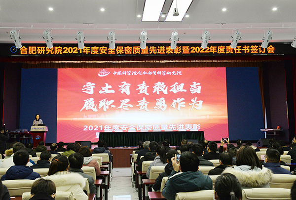 1月10日下午,合肥研究院召开2021年度安全、保密、质量先进表彰暨2022年度责任书签订会。合肥研究院院长刘建国、党委书记黄晨光、党委副书记兼纪委书记邹士平、副院长吴海信,各科研单元分管所领导、综合办分管主任,院机关管理部门负责人,获表彰的先进集体和先进个人代表参加会议。