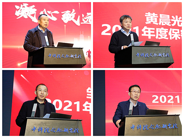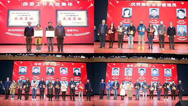 黄晨光、邹士平、吴海信分别宣读2021年度安全、保密、质量工作先进集体和先进个人的表彰决定。与会院领导、各科研单元负责人为受表彰的安全、保密、质量计量先进集体代表、先进个人代表颁发了奖牌、奖杯和荣誉证书。