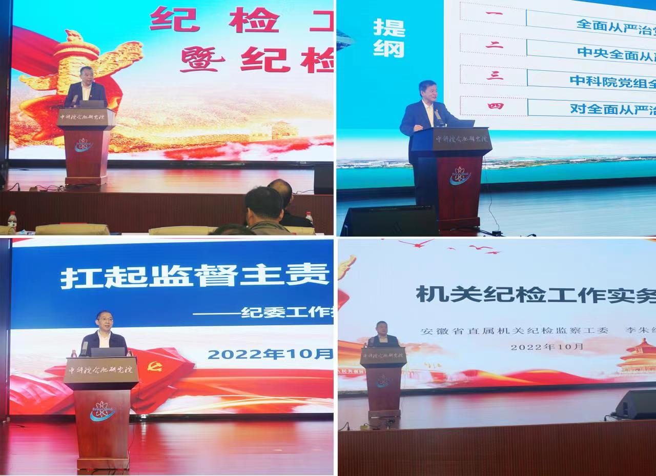 党委书记黄晨光作了《强化全面从严治党主体责任全力推进科技创新发展》首场报告,从全面从严治党的背景、意义、中央全面从严治党的制度、中科院党组的相关要求以及如何提高对全面从严治党的认识等几个方面做了阐述。邹士平作了《扛起监督主责抓实巡视整改》专题报告,详细阐明了纪委和纪检干部的职责和任务,并结合院党组对合肥研究院的巡视反馈意见,认真梳理合肥研究院纪检工作存在的问题,提出了整改思路与举措。会议还邀请安徽省直机关纪检监察工委李朱红以《机关纪检工作实务》为题,为合肥研究院纪检干部作专项培训报告。