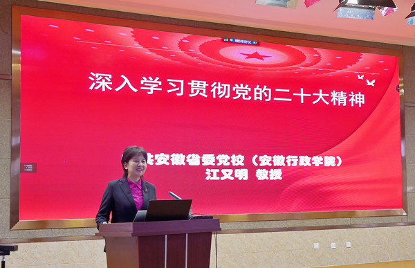 江又明作题为《深入学习贯彻党的二十大精神》的专题党课。她从深刻领会党的二十大的重大意义、准确把握党的二十大精神实质、迅速兴起学习宣传贯彻党的二十大精神的热潮三个方面对学习二十大精神进行了深刻系统的阐释。她强调,我们要全面贯彻习近平新时代中国特色社会主义思想,衷心拥护“两个确立”,忠诚践行“两个维护”,牢记空谈误国,实干兴邦,为全面建设社会主义现代化国家,全面推进中华民族伟大复兴贡献安徽力量。