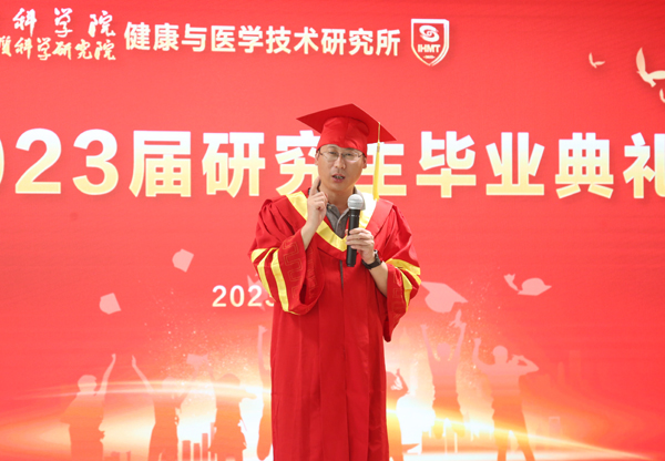 下午3:00,在庄严的国歌声中,典礼正式开始。健康所所长刘青松代表全所师生向2023届毕业生顺利完成学业表示热烈祝贺,向辛勤培育他们的导师表达诚挚感谢。他从哲学的角度给毕业生以启迪,他坦言世界的巨大偶然与未来的不确定,希望同学们在以后的科研工作生活中,坚持用周期性的眼光看世界和坚持事物的两面性思考解决问题,永葆创新精神,不畏艰难、不惧挫折,在创新实践中实现自己的价值。