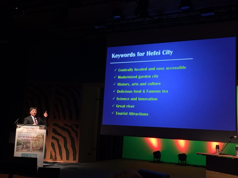 等离子体射频波大会作为射频波加热领域的专题大会,最初起源于美国,后由美、欧轮流主办,每两年召开一次。基于亚洲在聚变装置射频加热领域取得的突出成就,将亚洲纳入会议主办地在本届会议上被正式提上议程。在本届会议最后一日,经过激烈的大会讨论以及全体成员无记名投票,中国最终赢得下届会议主办权,开启了此大会由亚洲主办的历史。宋云涛研究员代表等离子体所作了下届会议申办宣传报告。下一届大会将由等离子体所承办,于2019年在中国合肥召开。
