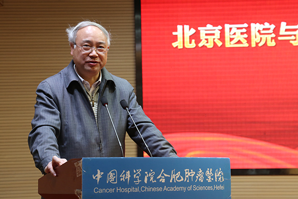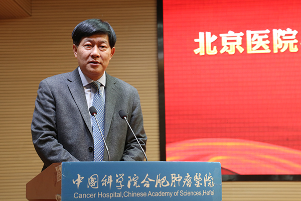 奚桓在发言中谈到,北京医院与中国科学院各单位的合作由来已久,医院也向来重视科学技术的进步对医学发展的重要作用。中国科学院合肥肿瘤医院作为中科院系统唯一一所研究型专科医院,科研与临床并重让很多最新的技术成果都能够快速有效地在临床进行试验和应用,真正做到了科研与临床的紧密结合。他认为两家单位的合作非常有意义,并希望双方能够在肿瘤相关的科研和临床领域展开更广泛的合作。
