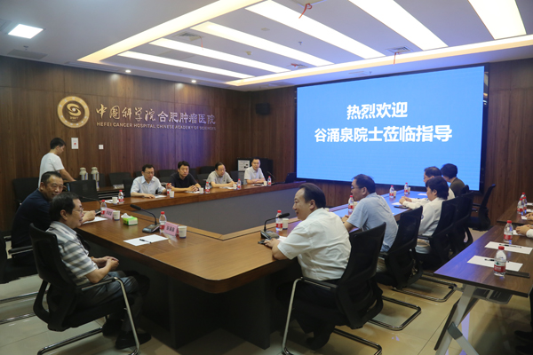 合肥物质院健康所党委书记、合肥肿瘤医院院长王宏志等向谷涌泉一行介绍了健康所及肿瘤医院的基本情况;肿瘤医院副院长王恩君就所院合一的体制机制、医研融合特色、代表性科研成果、创新诊疗模式及未来发展方向进行了专题汇报。谷涌泉对医院的体制机制创新和诊疗模式改革探索等给予了充分肯定。