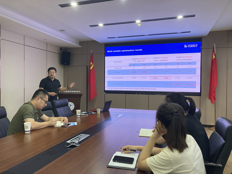 报告中,邢磊助理教授简要介绍了强风化CO2捕集技术的基本原理、技术优势及应用场景,重点阐述了两种经典化工反应器(涓流床和填充鼓泡塔)、两种水源(淡水和海水)、两种矿物(碳酸钙和硅酸盐)应用于强化风化作用的CO2捕集过程的技术研究。邢磊助理教授还介绍了利用M4(multi-physics, machine learning, multi-variable and multi-objective optimisation)仿真方法来研究不同化工反应器在CO2捕获率、能耗、水耗以及经济性等方面的表现,证明了M4方法是进行多变量和多目标优化的有效方法,可显著减少计算时间和资源,同时保持高的预测精度。通过模拟计算,可以权衡捕获速率、能耗和水耗以达到最优操作条件,将CO2捕获净成本下降至 400 $ t-1CO2,比当前的直接空气捕获 (DAC) 技术低20%以上。会后,与会师生和邢磊助理教授进行了热烈讨论与交流。
