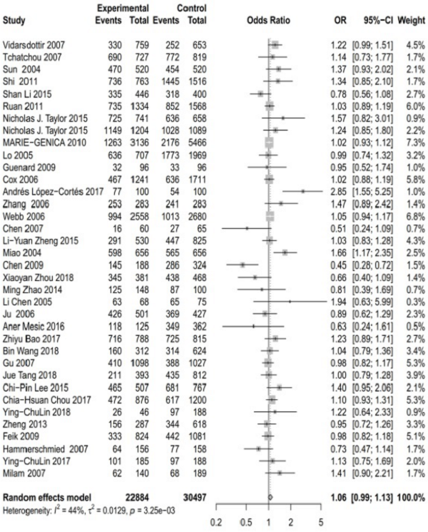图1.在显性模型(AT + AA与TT)下,AURKA rs2273535 T> A多态性与总体癌症风险之间关联的森林图。