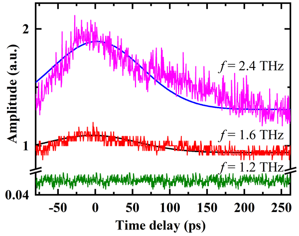 电子能量弛豫时间是电子材料的关键物理参数之一。利用CTFEL特有的太赫兹脉冲结构(特别是皮秒脉宽微脉冲结构),研究人员搭建了首创的“单色皮秒太赫兹泵浦-探测”系统(图1),并基于此系统测量了半导体材料的泵浦-探测特性以及电子能量弛豫时间,研究了室温下高迁移率n-GaSb晶体在不同自由电子激光辐照频率下的动力学电子特性。结合理论模型的拟合(图2)发现,在1.6THz(辐照功率为10W)和2.4THz(辐照功率为25W)激光辐照下获得n-GaSb晶体的电子能量弛豫时间分别为2.92 ps和2.32ps,这些结果与应用四波混频技术得到的实验结果一致。