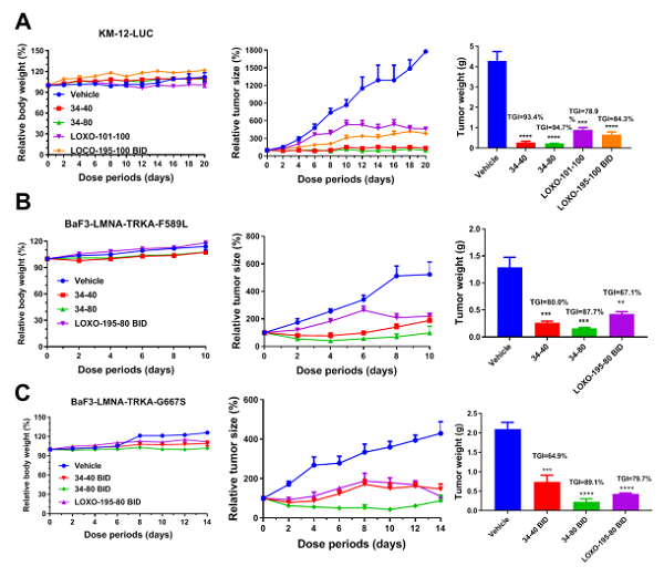 药学团队人员在前期研究中,基于团队自主构建的BaF3工程细胞库通过高通量筛选发现化合物CHFML-ABL-121对于TRKA/B/C有强烈的抑制作用,但是该化合物同时对多种激酶靶点具有抑制作用,且成药性较差。因此,研究人员基于II型激酶抑制剂的设计理念,通过药效片段组合等方法发展了一个高选择性并且能克服多种耐药性突变的新型TRK激酶抑制剂IHMT-TRK-284。该化合物在蛋白以及细胞水平对TRKA、TRKB和TRKC三种激酶及临床上相应的耐药突变均展现出很强的抑制作用。进一步的体内研究表明,IHMT-TRK-284在不同种属上显示出较好的药代动力学性质,并且在KM-12-LUC等多种细胞的小鼠移植瘤模型上呈现出剂量依赖性的抗肿瘤效果。目前该化合物正在进行全面的临床前药物评价。