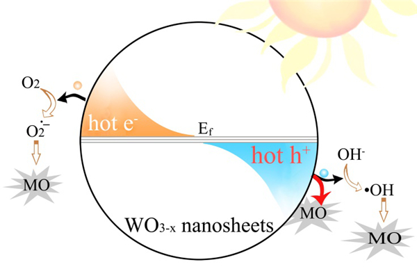 研究人员通过溶剂热法合成氧化钨纳米片后,采用氢气氛围下热还原方法,引入大量氧空位,成功将WO3-x纳米片的局域表面等离激元共振(LSPR)吸收中心蓝移至540 nm。这是目前报道的WO3-x纳米结构具有的最短LSPR吸收中心波长。此外,通过加载长波滤波片(>470 nm),排除WO3-x纳米片中可能出现的由带间跃迁产生的电子和空穴对催化的贡献,研究其表面等离激元产生的热电子和热空穴的催化性能。结果表明,所制备的WO3-x纳米片对甲基橙具有很好的光催化降解效果。通过不同的自由基捕获剂对比试验发现,WO3-x纳米片中产生的热电荷和热电子与溶解氧产生的超氧自由基在降解甲基橙过程中起主要作用。