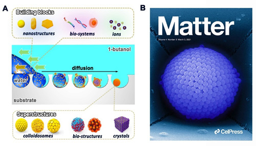 图1.(A)微球超结构的限域乳化自组装策略示意图;(B)封面图。