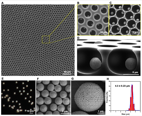该策略的关键点是,利用水和正丁醇的部分混溶特性,在孔模板中形成瞬态微乳液滴,分散在微乳液滴中的纳米颗粒在孔模板中进行组装。随着水相逐渐扩散到正丁醇相中,微乳液滴将自发耗尽,从而在每个孔中组装形成一个个均匀的微球超结构。