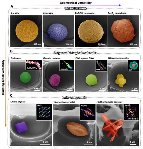 图3. 限域乳化自组装策略的普适通用性。(A)使用具有各种形状和成分的纳米颗粒为构筑基元的微球超结构SEM图;(B)使用聚合物和生物大分子为构筑基元的微球超结构SEM图,即壳聚糖,蛋白,鱼精DNA和葡萄球菌的细胞;(C)离子化合物(即NaCl,Na2SO3和Na2SO4)结晶为微晶的SEM图,SEM图中的颜色均为后期添加。插图显示了构建块的相应3D晶格图。