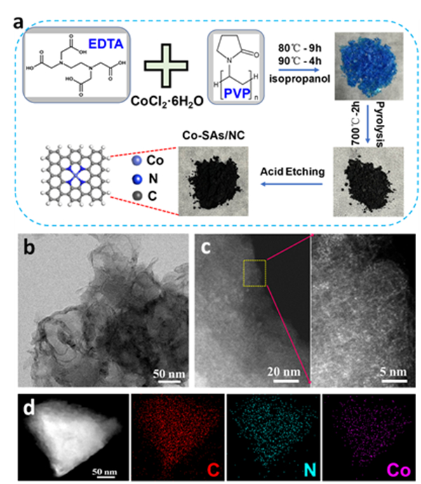 图1. Co-SAs/NC的合成示意图(a),TEM图(b),球差校正的HAADF-STEM图(c)和EDS能谱(d)。