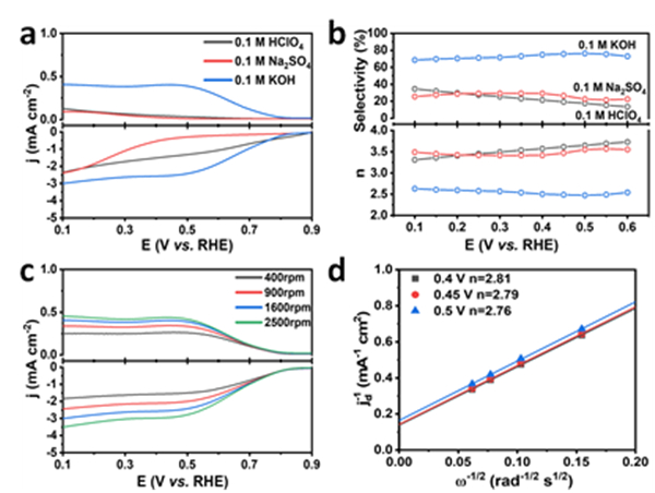 图2. (a)不同氧饱和电解质中Co-SAs/NC在1600 rpm时的LSV曲线;(b)H2O2选择性和转移电子数(n);(c)在0.1 M KOH下,Co-SAs/NC在不同转速下的LSV曲线;(d)Koutecky-Levich (K-L)图及其对应的n值。