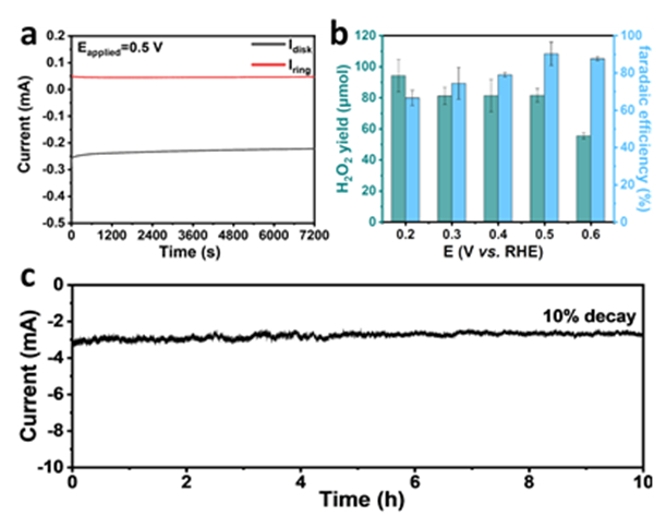 图3. (a)Co-SAs/NC的2 h稳定性测试;(b)不同电位下Co-SAs/NC反应2 h时的H2O2生成量及相应的法拉第效率(FE%);(c)Co-SAs/NC在0.5 V (vs. RHE)反应10 h时的I-t曲线。