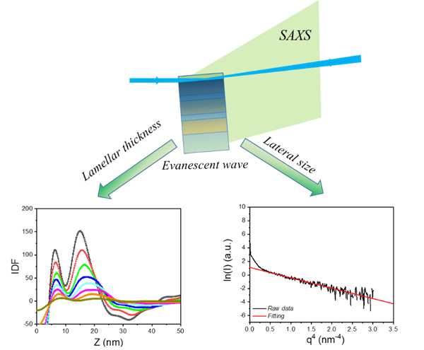 图 2. 衰减波诱导的散射以及利用其散射获取片晶厚度、长周期和横向尺寸示意图。