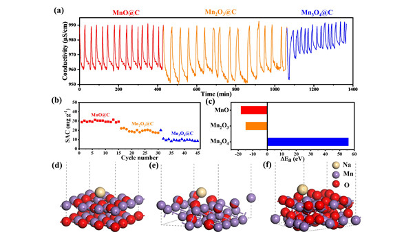 目前,淡水的日益枯竭和分布不均给社会经济发展带来了严峻的挑战。地球总表面积的71%被确定为海水,这是满足人类对饮用水需求的重要、潜在未开发水源,因此海水淡化被认为是一项可以解决淡水短缺问题的具有前景的工程。反渗透和热蒸馏是处理高盐浓度的海水或咸水广泛采用的技术,但这种方法在盐浓度较低的情况下能耗高且成本高。作为一种替代方法,电容去离子技术(CDI)可以通过双电层电吸附或赝电容反应去除离子,使高盐浓度的水脱盐。其中,高价态MnO2(IV)作为CDI中优异的法拉第电极被大量研究,尤其对MnO2不同晶型所表现的脱盐性能差异进行了深入的机理分析,但关于低价锰氧化物的研究鲜有报道。这种不同Mn价态所赋予的电容脱盐性能是否存在差异以及其内在机制值得进一步探讨。