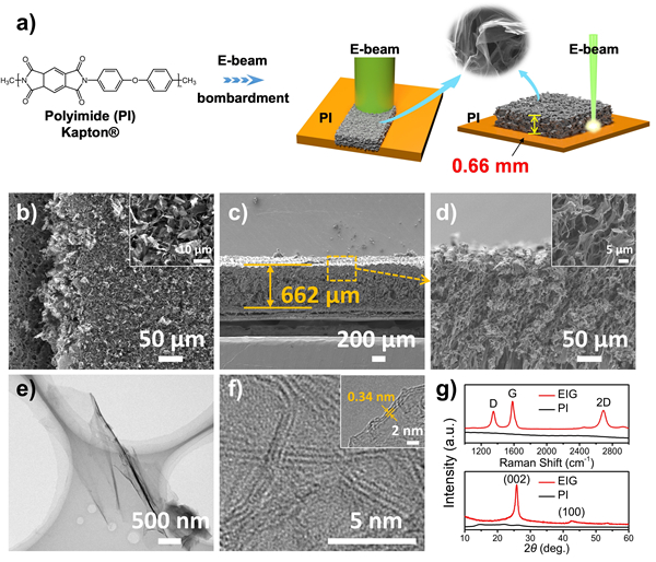 图1. (a) 电子束轰击在聚酰亚胺上诱导形成宏观厚度3D多孔石墨烯薄膜的过程;(b) EIG的SEM图像;(c-d) EIG截面的低、高倍率SEM图像;(e-f) EIG的TEM图像和HRTEM图像;(g) EIG和聚酰亚胺薄膜的拉曼光谱(上图)和XRD光谱(下图)的比较。