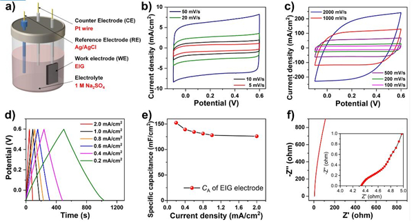 图2. EIG电极的电化学特性:(a) 三电极测试系统示意图;(b-c)在不同扫描速率下的CV曲线;(d) 不同电流密度下的GCD曲线; (e) EIG电极的面积比电容(CA)随电流密度变化的曲线;(f) EIS分析。