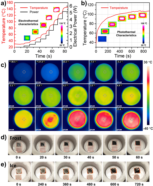 图3. (a) EIG材料的电热特性曲线和红外图;(b) EIG在室温下的光热特性曲线和红外图;(c) EIG在低温环境(?40 °C)下的光热性能;(d-e) EIG与聚酰亚胺薄膜的光热除冰性能比较。