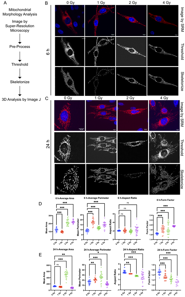 图5: 细胞辐照6小时和24小时后线粒体形态的分析