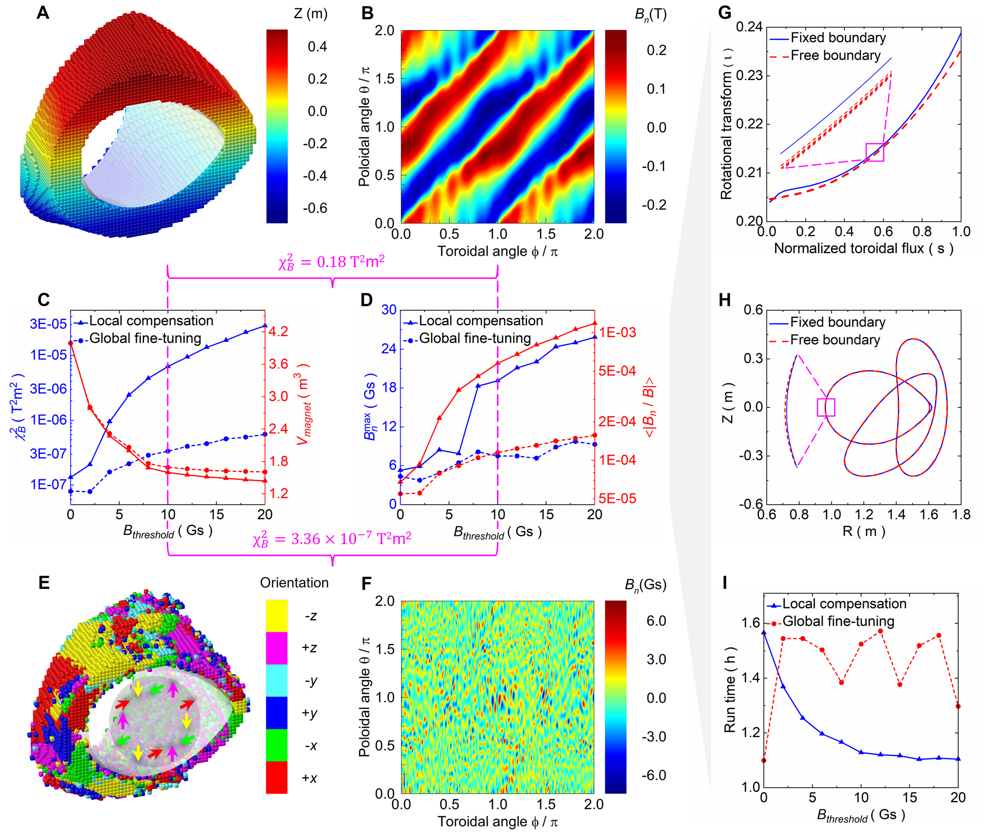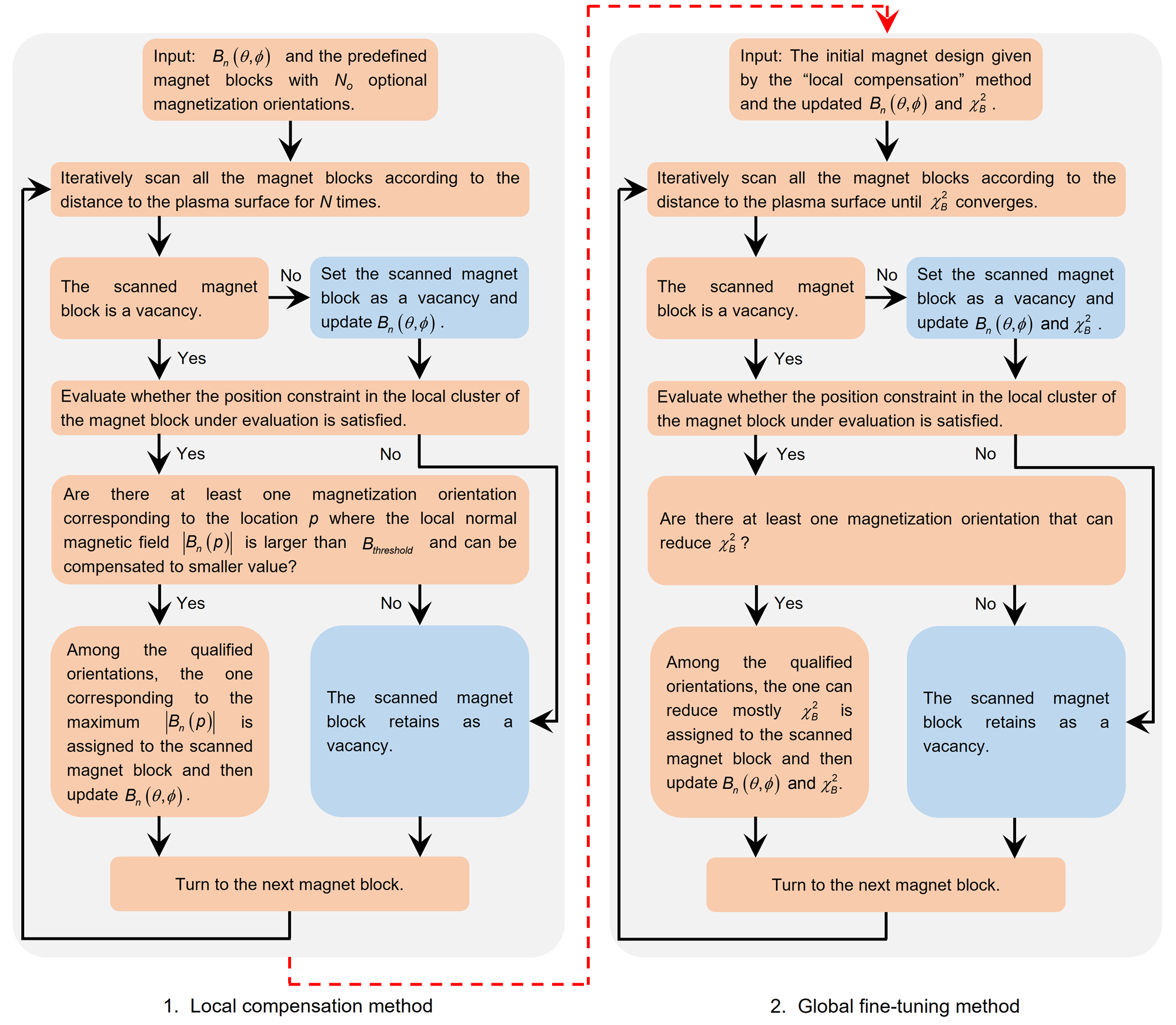 近两年,结合永磁体的仿星器成为国际仿星器研究领域的一个新热点,而如何用工程简单的永磁体块产生所需的三维磁场是此研究的难点。国际上目前提出了几种采用永磁体小块拼装的设计方案,然而这些方案所使用的永磁体块的大小、形状、剩磁强度各异、甚至磁化方向在空间上连续变化,以致于加工制造成本高昂,装配精度难以得到保证,不便于工程实现。近期,徐国盛研究员课题组在国际上首次提出了一种标准化永磁体设计策略。该策略采用了“分治策略”的思想,将大量永磁体块的设计过程分解为逐个设计每一块永磁体,然后进行多次迭代以获得最优设计,迭代过程包括局部优化和全局优化两个部分。这种逐个设计的思路可以很容易高度限定每一块永磁体的具体形式,直接以工程实现为出发点进行永磁体设计。基于该设计策略,徐国盛研究员课题组实现了仿星器永磁体的标准化,即所有永磁体块大小、形状,剩磁强度完全相同且磁化方向为有限个指定方向之一,例如剩磁强度相同且磁化方向垂于其六个面之一的立方体永磁体块。这种设计使得永磁体块可以批量生产,极大地降低了加工制造成本。此外,统一的大小、形状使得永磁体块可以像乐高积木那样拼装起来,非常有利于装配精度控制。这项成果的出现将会促使永磁体仿星器从概念设计阶段真正迈向工程实现,极大地推动仿星器的发展。