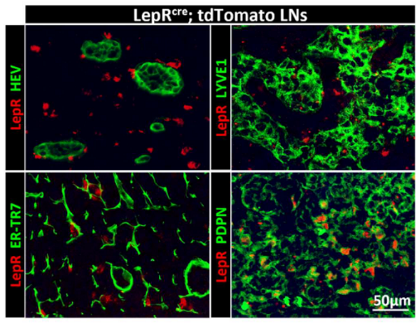 荧光显微照片显示HEV和淋巴管周围的一类特殊的表达瘦素受体的基质细胞亚群