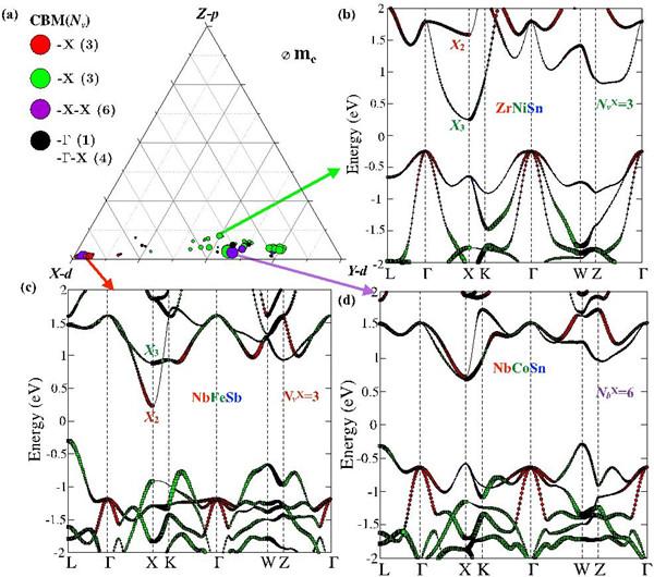 图3. (a)VCoSn和(b)TaCoSn的投影能带结构图;(c)V0.5Ta0.5CoSn的反折叠能带图;(d)两类导带(X2和X3)能量差随掺杂组分变化示意图。