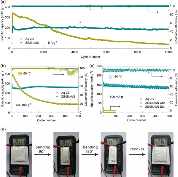 基于此,研究团队开发了一种机械性能优异、离子电导率高和具有宽操作温区(-20~60℃)的功能性水凝胶电解质。由该水凝胶制备的锌离子电池具有稳定的循环性能(循环超过3000 h)、优异的电化学性能(在5 A·g?1下循环10000圈,容量为185 mAh·g?1)和高可逆的锌嵌入/脱出(库伦效率达到99.5%),在-20-60℃的温度条件下,具有很好的稳定性和高的容量。此外,这种功能性水凝胶具有很好的拉伸、扭曲、压缩和吸附性能,使得其具有制备柔性储能器件的潜力。以此水凝胶为基础制备的柔性软包电池具有很好的机械稳定性,在不同的弯曲角度下仍能保持稳定的电压和容量。这种多功能凝胶电解质为开发高性能可充电水系锌离子电池提供了一种很有前景的策略。