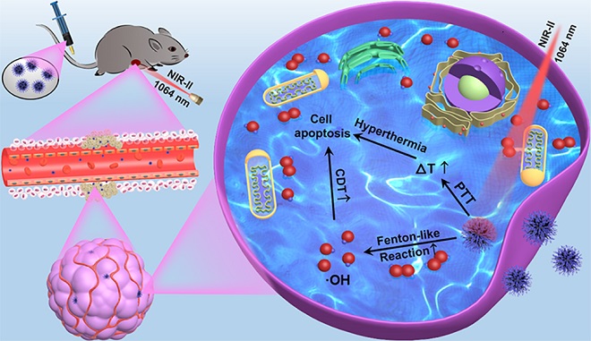 近年来,因其非侵入性治疗方式和低副作用,基于芬顿或类芬顿反应原位产生羟基自由基(·OH)的化学动力学疗法(CDT)受到广泛关注。具有高组织渗透和低组织散射等优点的NIR-II介导的光热治疗(PTT)同样具有广阔的应用前景。因此,PTT&CDT的联合治疗是非常具有应用潜力的协同治疗方式。目前,在已报道的各种非金属基或金属基纳米材料作为发生CDT的芬顿剂和PTT的光热剂中,由于材料本身不稳定、催化效率低或光热转化效率低等缺点,难以在PTT&CDT的联合治疗方面取得更大的进展。因此,需要设计一种具有良好稳定性、足够的催化效率和光热转化效率的治疗剂应用于联合治疗方式。