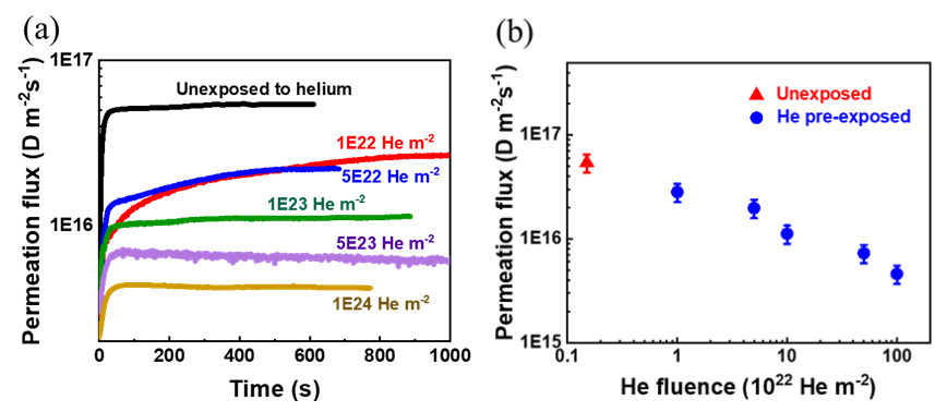 在聚变堆边界等离子体与材料的相互作用下,氘氚会进入材料表面,渗透穿过第一壁进入到内部的冷却剂,增加反应堆的燃料成本以及安全风险。与此同时,氘氚聚变反应产生的氦也会直接轰击材料表面,影响氘氚在材料中的渗透滞留行为。