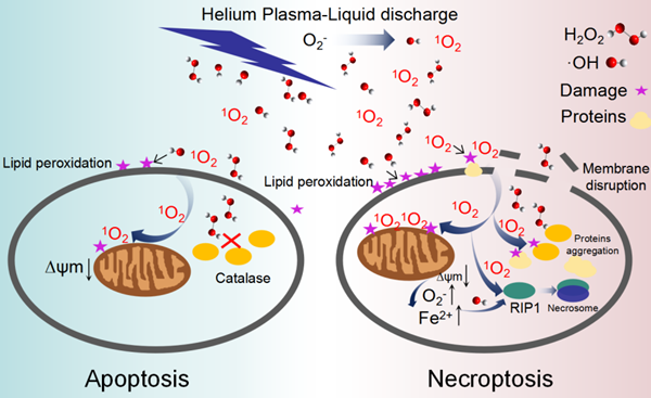 科研人员在前期研究的基础上,以真菌模式生物酵母为研究对象,深入研究了低温等离子体产生的ROS(·OH,1O2,H2O2,O2-)情况,特别探讨了它们与胞内各种ROS(·OH,1O2,H2O2,O2-)的随时间变化关系(图1)。研究发现,在等离子体产生的各种ROS中,·OH主要通过破坏壁膜结构导致真菌失活,而1O2与其它ROS具有协同杀灭真菌的作用。等离子体产生的1O2能够诱导线粒体膜电位(MMP)去极化,而MMP去极化程度的不同决定了细胞的不同命运。在短时间的等离子体处理过程中,线粒体轻度损伤会导致细胞凋亡的发生。而长时间处理,等离子体产生的·OH会严重损伤细胞膜,大量的1O2会诱导MMP严重去极化,继而能够导致胞内O2-和Fe2+的增加,从而导致细胞的坏死。此外,团队还发现1O2诱导能够导致胞内蛋白聚集,坏死体RIP1/RIP3产生,最终导致程序性坏死发生(图2)。