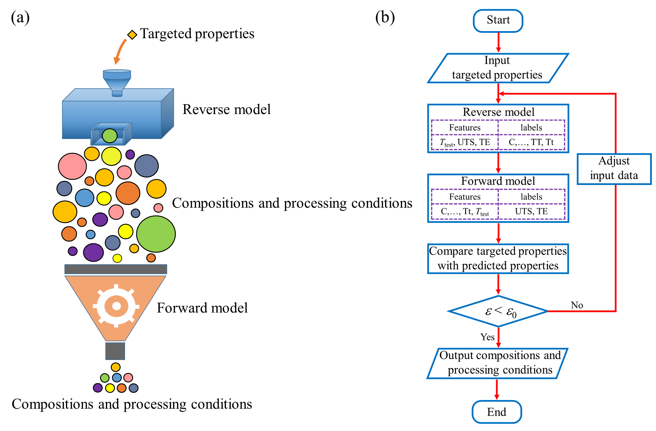 由传统9Cr-1Mo钢发展而来的RAFM钢,因其具有良好的热物理、热机械和抗辐照性能,被认为是聚变反应堆理想的候选结构材料之一。然而,高温(>550 ℃)实验表明,RAFM钢存在明显的高温软化效应,这严重限制了其高温应用及服役安全性。为满足未来商用聚变堆材料更高服役温度的要求,需要进一步优化RAFM钢的高温力学性能,这对于传统的“实验试错法”是一个很大的挑战。近年来发展的机器学习方法为优化设计高性能RAFM钢提供了一种新的可行性途径。目前的机器学习模型主要是建立从成分和工艺参数到性能的正向模型,并从巨大的虚拟空间中筛选出良好的候选组合,还无法有效实现面向性能的逆向设计(即“按需设计”)。