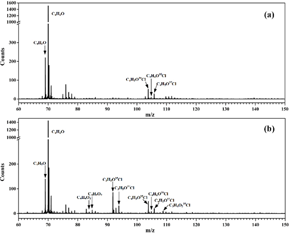 添加O2前后Cl和异丁烯醛反应的光电离质谱图