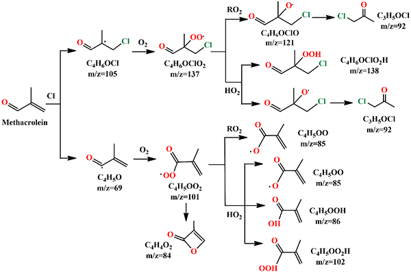 结果表明,氯原子与异丁烯醛之间通过夺氢和加成反应分别生成C4H5O和C4H6OCl自由基,且与氧气(O2)进一步反应生成C4H5OO2 和 C4H6OClO2过氧自由基。在低氮氧化物(NOx,NO和NO2)条件下,过氧自由基继续与自身以及HO2自由基发生双分子反应,产生C4H5OO、C3H5OCl、C4H6OClO2H等产物。通过关键产物的动力学实验,结合高精度理论计算分析,获得了氯原子与异丁烯醛氧化反应详细的化学机制,有助于理解异丁烯醛在大气中的化学行为。