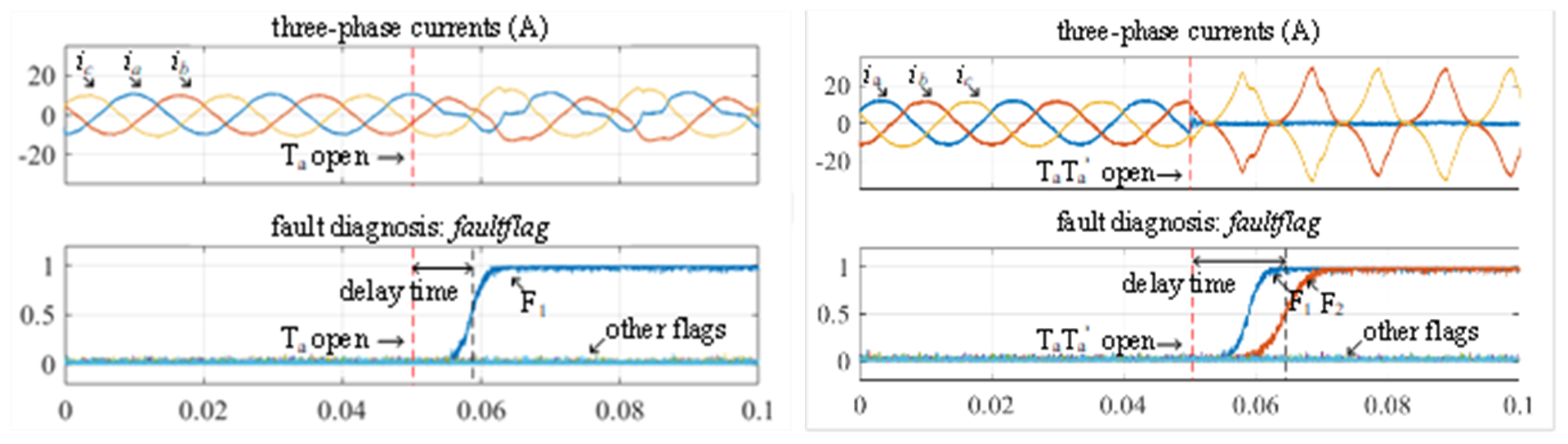 图4:三相电流其故障诊断特征量波形.(a)整流状态下,Ta故障. (b)逆变状态下,Ta和Ta‘故障