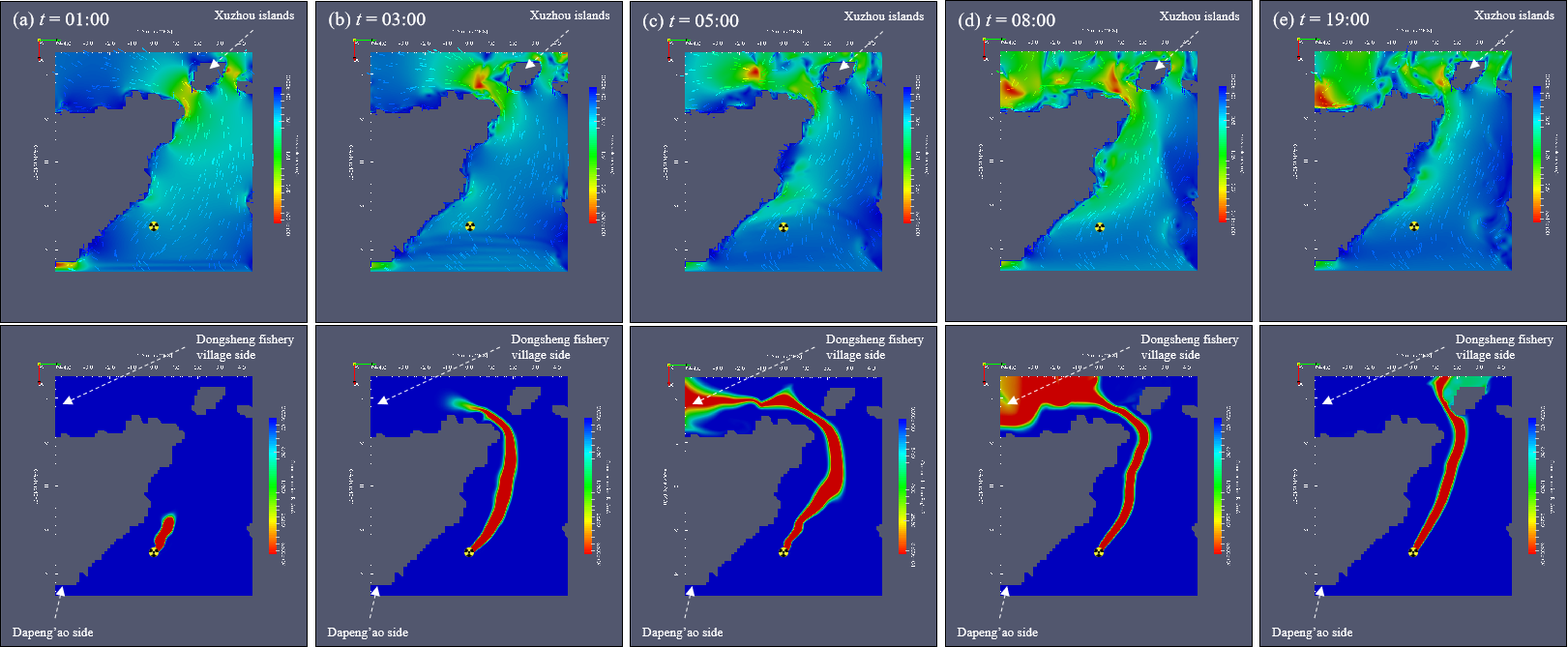 图3:核泄漏事故后不同时刻近岸流场(上)及核素浓度(下)分布的动态仿真 模拟
