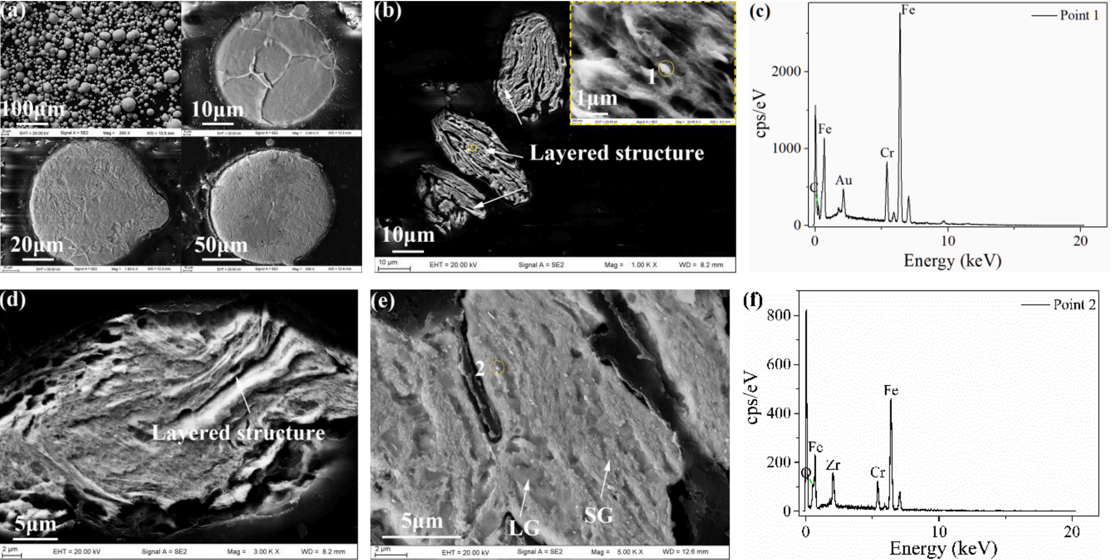 图2 粉末演变过程:(a)CLAM钢雾化粉末的相组织,(b-d)ODS粉末的组织及析出相,(e-f)ODS粉末热处理后的组织及析出相